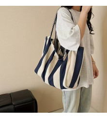 El patrón a rayas en tonos navy y beige ofrece un diseño atemporal que complementa cualquier atuendo,outfits de trabajo hasta looks casuales de fin de semana. Este bolso tote es una solución versátil.